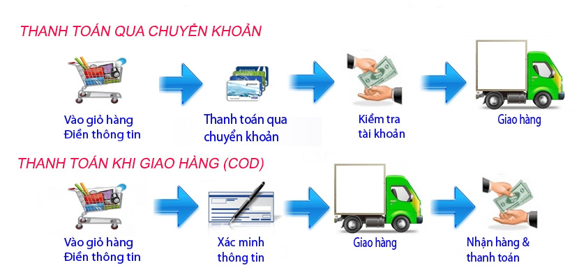 - Thanh toán khi giao hàng (COD): Chúng tôi cho phép quý khách thanh toán bằng tiền mặt cho nhân viên giao hàng ngay khi nhận được sản phẩm.